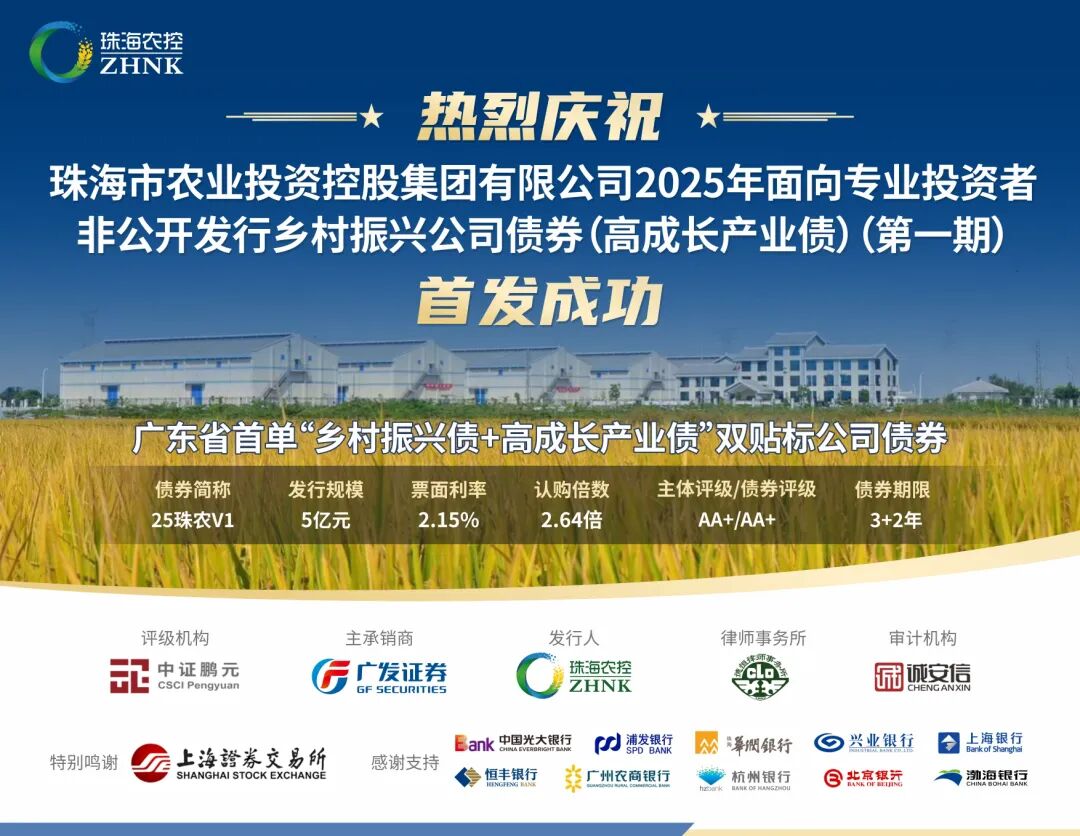 9月25日,珠海市農(nóng)業(yè)投資控股集團(tuán)有限公司(以下簡(jiǎn)稱(chēng)“珠海農(nóng)控集團(tuán)”)2025年面向?qū)I(yè)投資者非公開(kāi)發(fā)行鄉(xiāng)村振興公司債券(高成長(zhǎng)產(chǎn)業(yè)債)(第一期)在上海證券交易所成功發(fā)行,本期債券發(fā)行規(guī)模5億元,期限為3+2年,票面利率2.15%,創(chuàng)全國(guó)同評(píng)級(jí)、同期限鄉(xiāng)村振興私募公司債歷史新低。