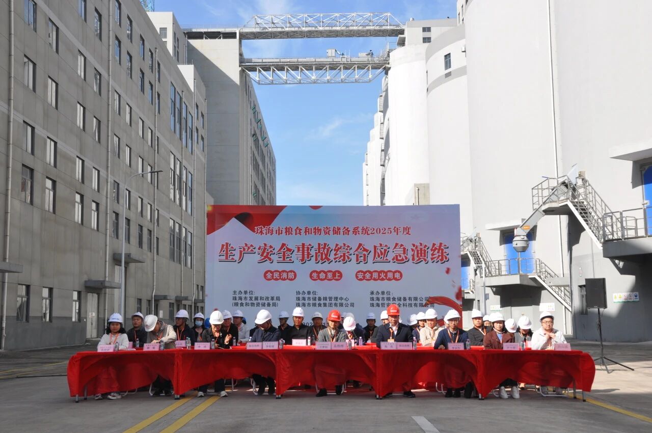 為深入貫徹落實(shí)習(xí)近平總書(shū)記關(guān)于安全生產(chǎn)的重要指示精神,切實(shí)筑牢糧食和物資儲(chǔ)備安全防線(xiàn),全面提升糧食和物資儲(chǔ)備行業(yè)突發(fā)事件應(yīng)急處置能力,2025年11月28日,由珠海市發(fā)展和改革局主辦,珠海市儲(chǔ)備糧管理中心、珠海糧食集團(tuán)承辦的“2025年珠海市糧食和物資儲(chǔ)備系統(tǒng)生產(chǎn)安全事故綜合應(yīng)急演練”在珠海中心糧庫(kù)圓滿(mǎn)舉行。市發(fā)改委黨組成員、副局長(zhǎng)王夢(mèng)陽(yáng),珠海農(nóng)控集團(tuán)黨委委員、副總經(jīng)理祝杰,市儲(chǔ)備糧管理中心主任李錦鎮(zhèn)等現(xiàn)場(chǎng)觀(guān)摩指導(dǎo),全市各區(qū)糧食系統(tǒng)相關(guān)負(fù)責(zé)人、安全管理人員及一線(xiàn)作業(yè)人員代表共100多人參與演練。